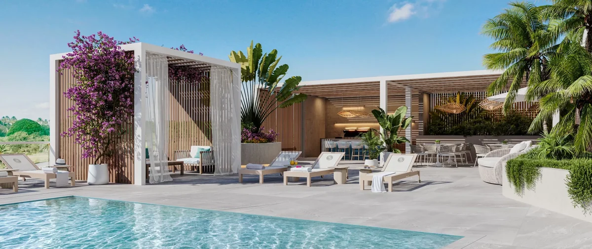 - Piscina estilo centro turístico y spa con tumbonas y cabañas.