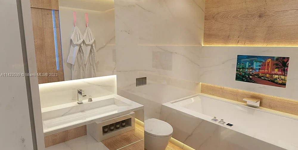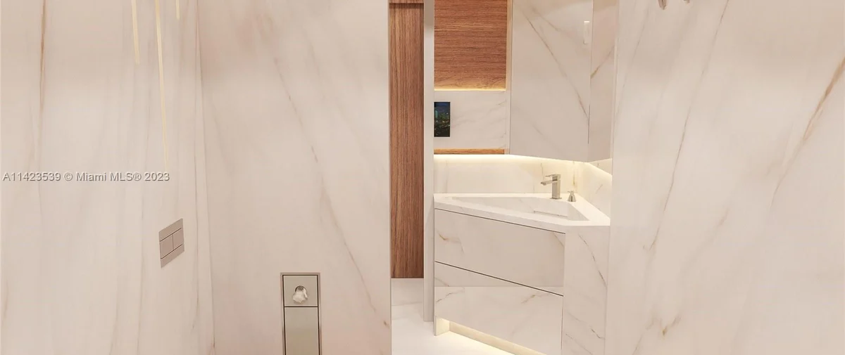 - Granite vanity top with full width mirror and porcelain lavatory and bidet