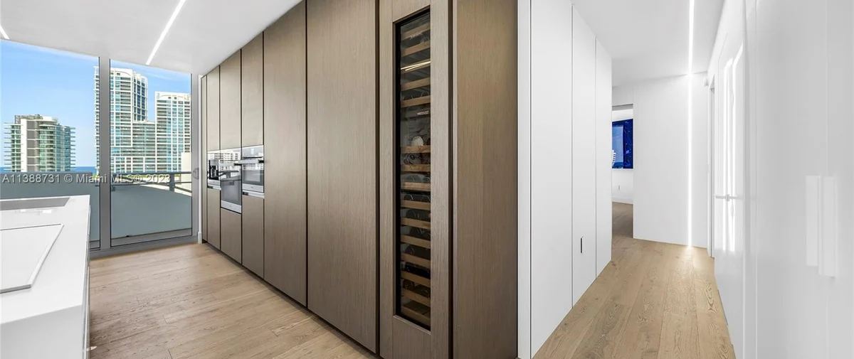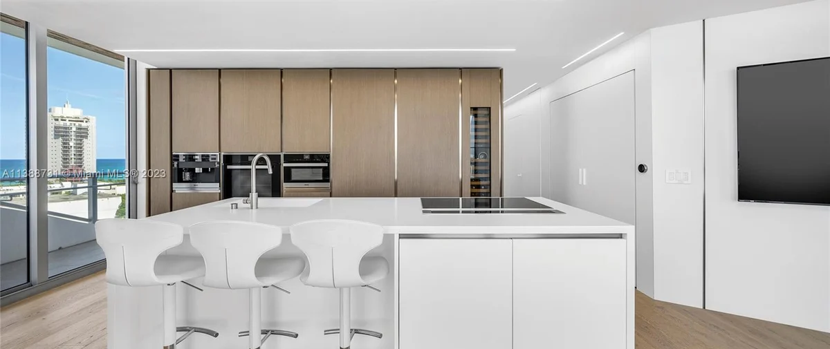 - Miele kitchen appliances including built-in oversized refrigerator/freezer, dishwasher, cooktop, oven, wine storage, and coffee maker
