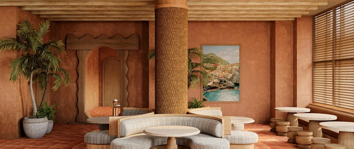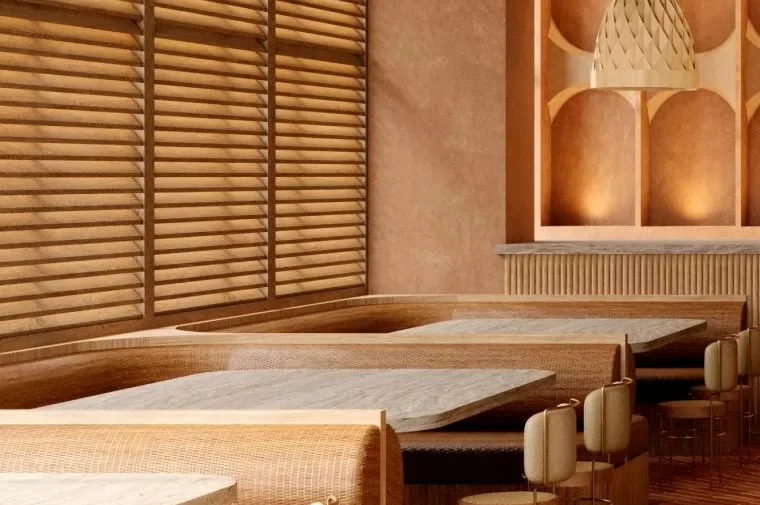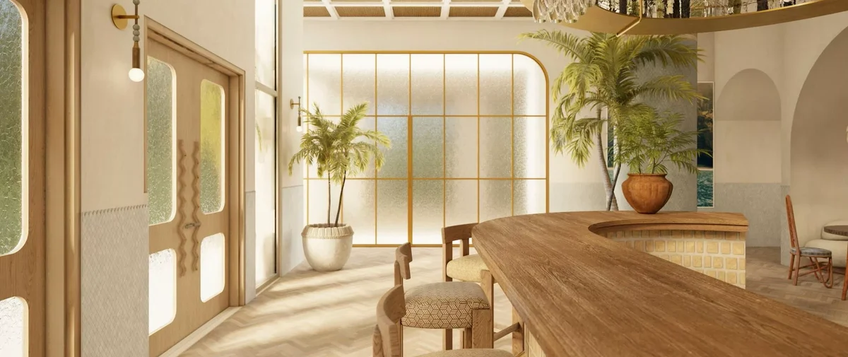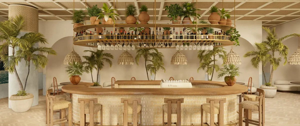 - VESTÍBULO | ENTRADA PRINCIPAL: lobby bar y área diseñada con materiales naturales y tonos cálidos para crear esa sensación de conexión arraigada.