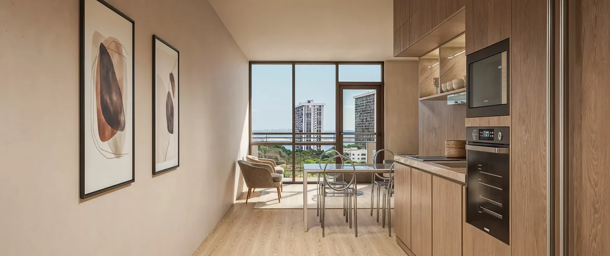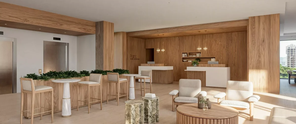 Con vistas al exuberante parque Simpson. El edificio alberga 185 unidades con diseño elegante en 8 pisos. Cada unidad se entrega completamente amueblado por Restoration hardware, lo que garantiza una combinación de sofisticación y confort.