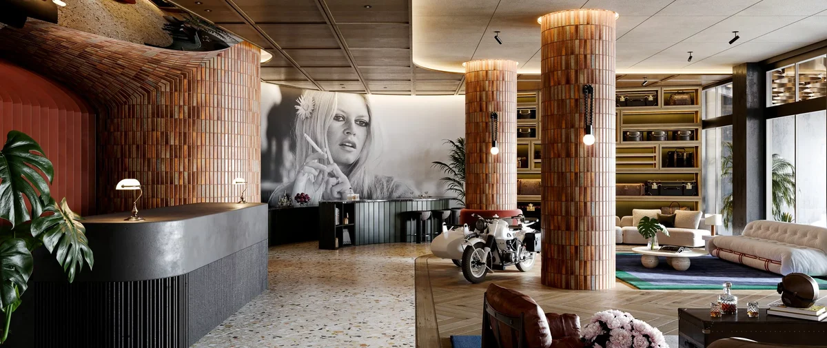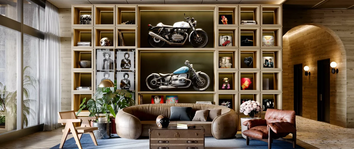 - Lobby épico adornado con obras de arte e incluso motocicletas.