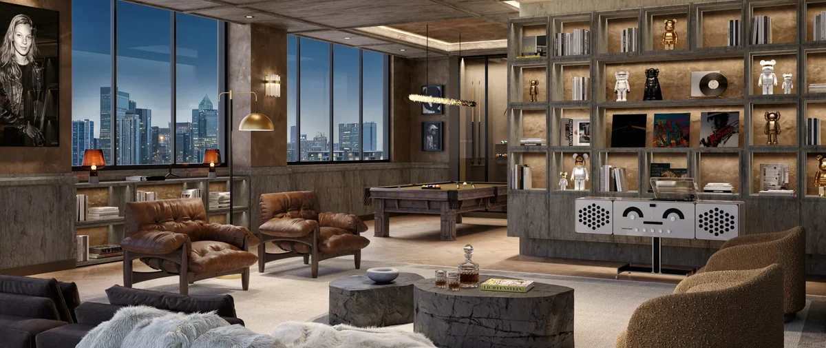 - Un salón para residentes (VINILO) con mesa de billar, pantalla de teatro y DJ Turntable Ensemble.