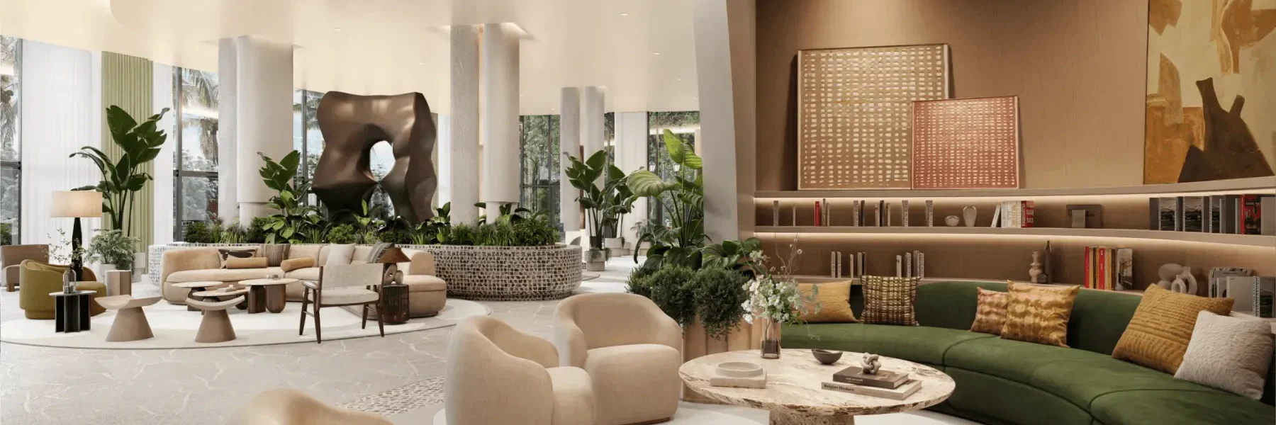 - Impresionante vestíbulo de techo alto con un elegante salón para residentes e invitados diseñado por Meyer Davis Studio.