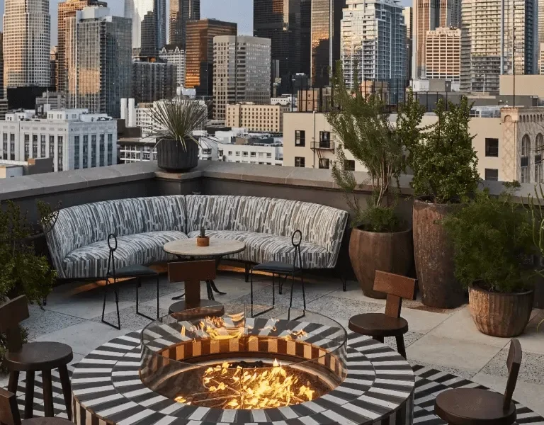 - Amenidades en piso 7o con una terraza que incluye piscina, spa al aire libre y cabañas junto a la piscina.