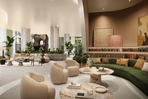- Impresionante vestíbulo de techo alto con un elegante salón para residentes e invitados diseñado por Meyer Davis Studio.