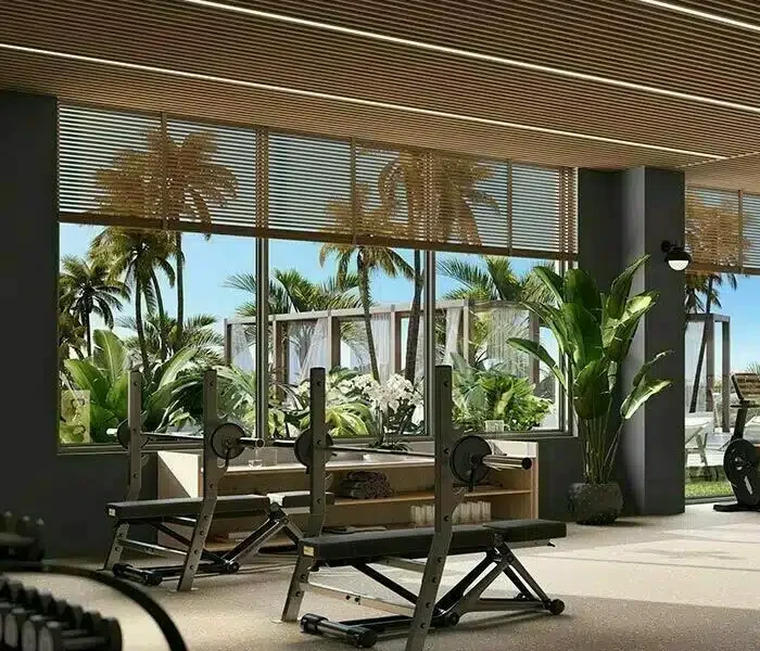 - Gimnasio de última generación totalmente equipado con Technogym con vista tropical al área de la piscina del resort.