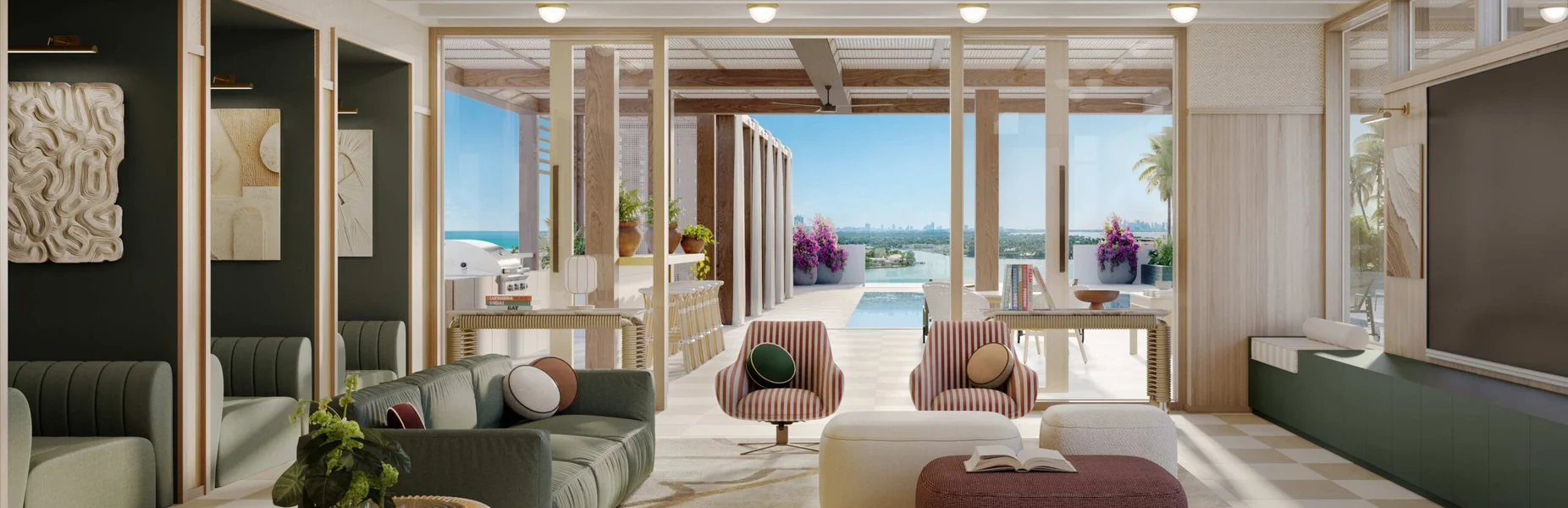 - Salón para residentes en el nivel de la piscina con asientos en el interior y al aire libre y áreas de trabajo/juego.