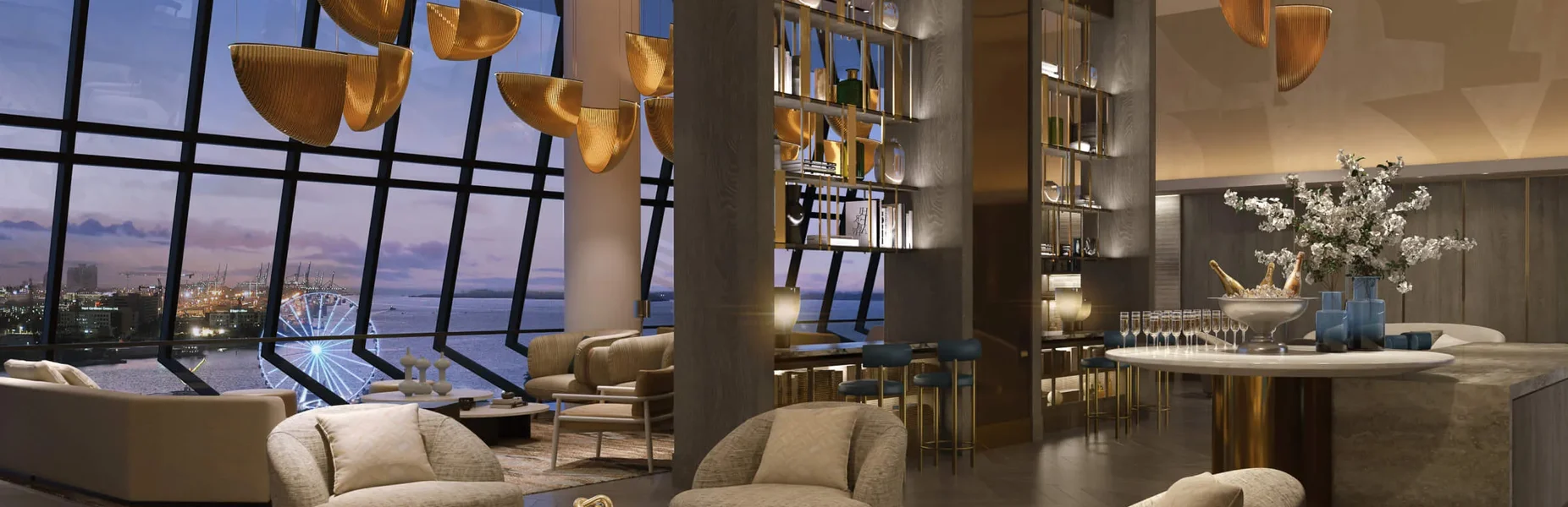 - Owners Lounge con techos altos, sala de billar y entretenimiento con vistas panorámicas a la bahía, diseñada para funciones privadas y equipada con cocina de catering adyacente.